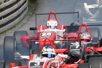 日曜日のレースも48周で行われました。ユーロF3はリバースグリッドが採用されており、7番手からのレース2に臨みました。スタートでうまく加速することができ、6番手に上がりイン側をキープしながら1コーナーに向かっていきました。前を走るマシンがイン側に固まっており、外側に大きくスペースが開いていました。考えた末、思い切ってアウトに飛び込みました。イメージ通りに開いているスペースをうまく使い、ポジションを上げたのですが、コーナー立ち上がりで1台が接触した際にスピン。それを避けようとしたところに後ろからマシンが乗り上げてきてストップしてしまいました。このアクシデントで赤旗が提示されレースは中断になりました。その後、再スタートを試みたのですが、マシンのダメージがひどく、再び走行することができませんでした。結局、そのままレースを終えることになってしまいました。