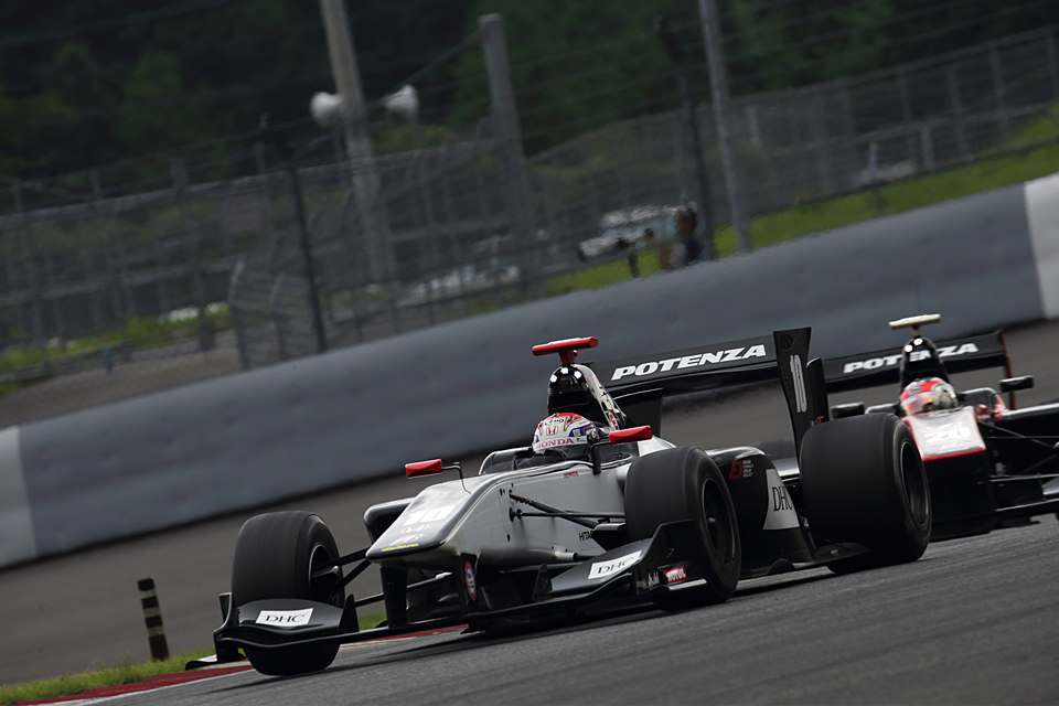 第3戦は静岡県の富士スピードウェイで行われました。前回の岡山からチームとミーティングを行い、セッティングについてエンジニアと話し合いました。土曜日は台風の影響もあり、雨が降る中で公式練習が始まりました。雨の中でも積極的に周回を重ね、データ収集につとめました。
